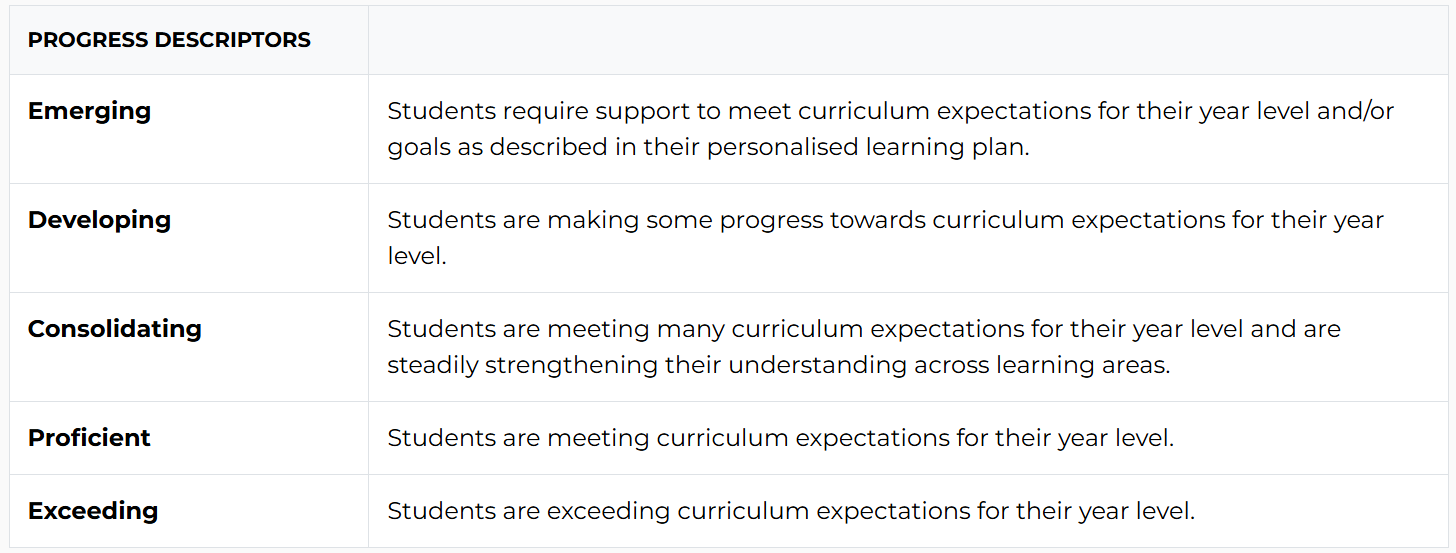 Students will be given a level: Emerging, Developing, Consolidating, Proficient, and Exceeding. This reflects where they are in relation to a set of skills expected of their year level.